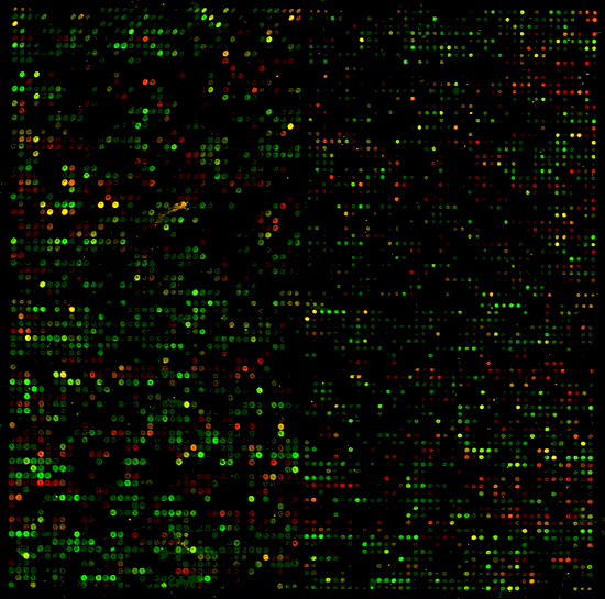 Every yeast gene is represented by an individual spot. The color indicates how often the gene is made into protein in one condition versus another (e.g., food vs. no food; see text for detail).